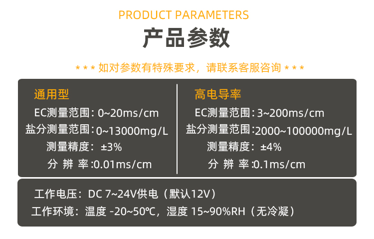 測量方法:電流電壓2電極測量 EC值測量范圍:0~0.2ms/cm,0~2ms/cm,0~20ms/cm(默認) 鹽分測量范圍: 0~100mg/L, 0~1100mg/L, 0~13000mg/L 測量精度:±3% 分辨率:0.01mS/cm(對應0~20ms/cm量程) 測量重復性:±1% 測量穩定時間:2秒 響應時間:<5秒 溫度補償:具備 | 測量方法:電流電壓2電極測量 EC值測量范圍: 3~200ms/cm 鹽分測量范圍: 2000~100000mg/L 海水鹽分測量范圍:10000~50000 mg/L或10~50 psu 測量精度:±4% 分辨率:0.1mS/cm(對應3~200ms/cm量程)或50mg/L 測量重復性:±1% 測量穩定時間:2秒 響應時間:<5秒 溫度補償:具備 |