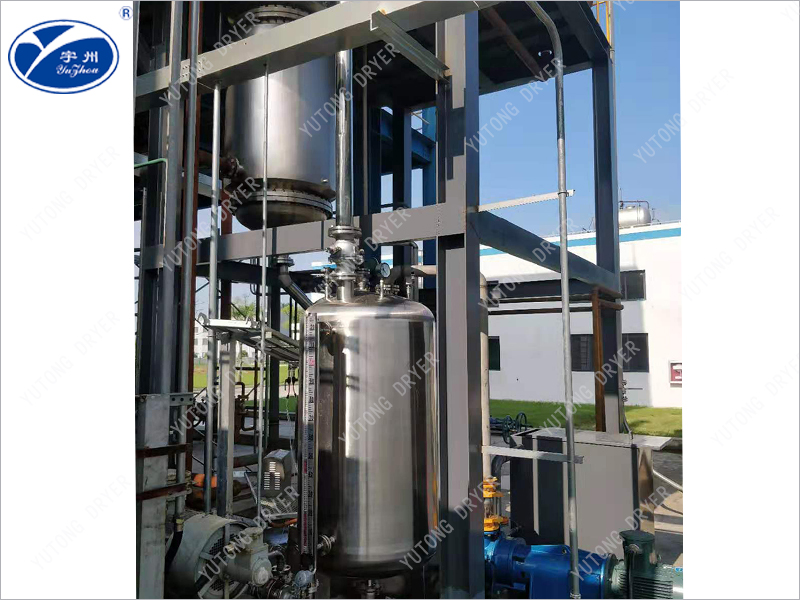 The material enters the evaporator radially from the top of the heating area, and is distributed to the heating wall of the evaporator through the distributor. Then the rotating film scraper squeezes the material into a liquid film of uniform thickness on the heating surface continuously and uniformly, and pushes it downward in a spiral shape. In this process, the rotating film scraper ensures that the continuous and uniform liquid film produces high-speed turbulence, and prevents the liquid film from coking and scaling on the heating surface, thereby improving the total transfer coefficient. The light components are evaporated to form a steam flow, which reaches the external condenser directly connected with the evaporator through the vapor-liquid separator, and the recombination is discharged from the cone at the bottom of the evaporator. A unique distributor not only has the ability to evenly flow the material to the inner wall of the evaporator to prevent the material from splashing into the steam stream inside the evaporator, but also has the ability to prevent the newly entered material from flashing here, which is conducive to the elimination of foam, and the material can only evaporate along the heating surface. The upper part of the scraper evaporator is equipped with a centrifugal separator designed according to the characteristics of the material, which separates the droplets from the rising steam stream and returns them to the distributor.