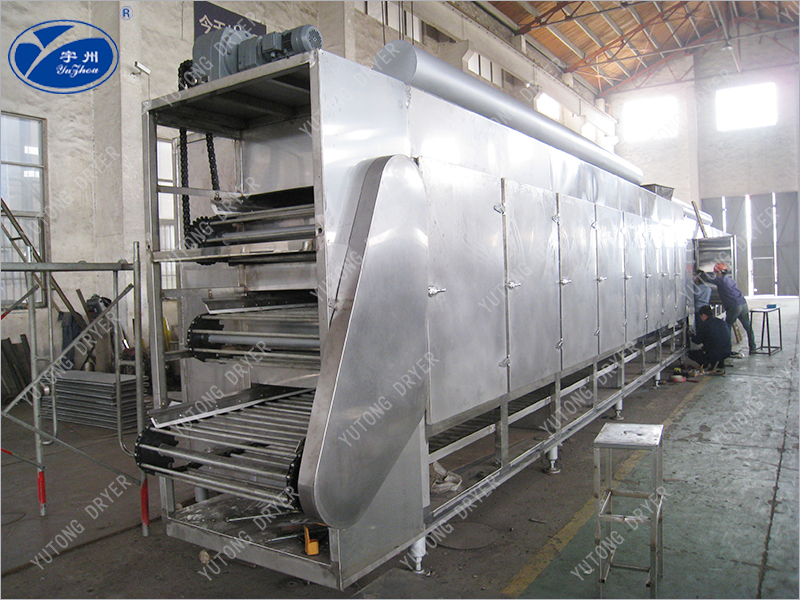 2、the series of belt dryer to be processed materials using multi-layer mobile stainless steel mesh belt or vibration plate, hot air flow through the mesh belt and the material layer on the bottom up, heat exchange uniform, sufficient, high production efficiency, good product quality, with a cold layer and rotary feeding device, low discharge temperature, conducive to timely packaging.