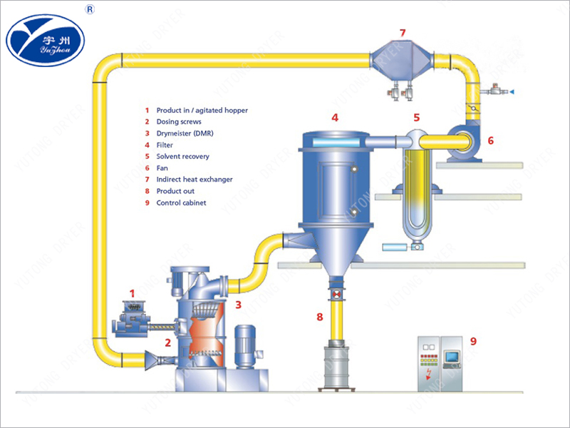 Introduction:Closed loop flash evaporation dryer is a new type of closed dryer developed by Jiangsu Yutong based on advanced foreign technology. The closed-circuit drying system works in a closed environment, and the drying medium is inert gas, which improves the safety factor of the equipment.