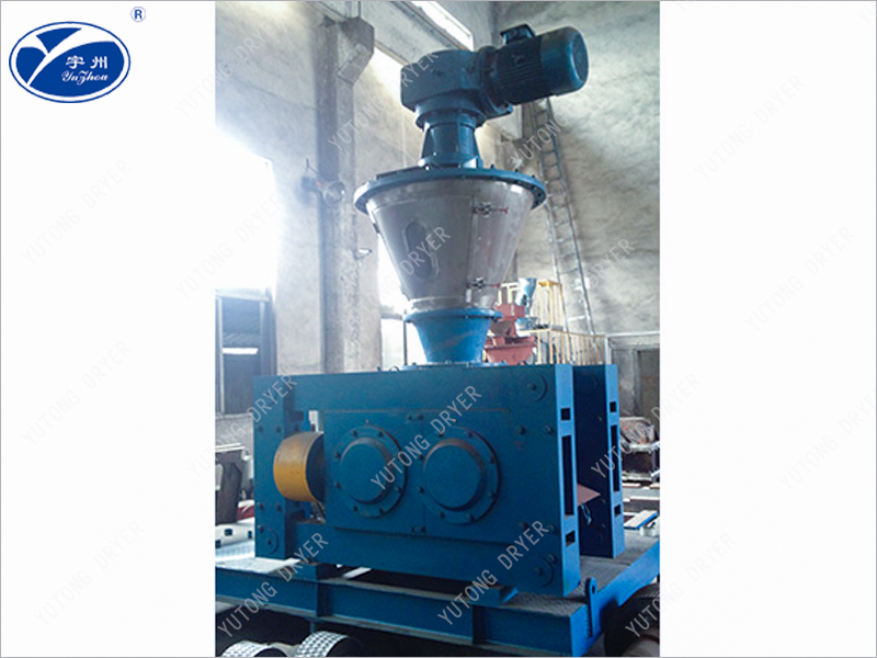 Various dry powder materials are added from the top of the equipment, and after degassing and spiral preloading, they enter two equal rolling rolls. The rolling rolls rotate relative to each other, and the materials are forced into the gap between the two rolls. The grooved rolling rolls bite the materials into the gap and are forced to compress them. After passing through the compression zone, the surface tension and weight of the materials naturally release them. The detached finger shaped agglomerates enter the crusher and are crushed by a rotating blade. The crushed material enters the granulator and is sieved by a rotary vibrating screen through a rolling blade. Qualified products are transported to the finished product warehouse through a conveyor. The powdered screened material is sent back to the raw material warehouse for secondary rolling through a conveyor, and the squeezing force can be adjusted by the pressure of the hydraulic cylinder according to the needs of the granulation operation. By changing the groove form of the roller surface, sheet, strip, and flattened spherical materials can be obtained.