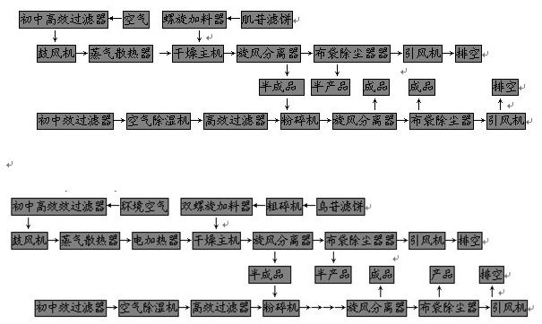 肌苷、鳥苷旋轉閃蒸干燥設備專用于肌苷與鳥苷兩種特料的干燥,干燥主機與物料接觸處均采用SUS304不銹鋼,配備了旋風+布袋除塵兩級收料,采用蒸汽與電加熱補充的熱源方式,并配有粉碎、冷卻及氣力輸送系統,采用PLC集中控制,自動化程度較高。