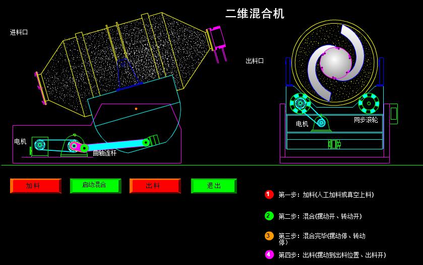 產品描述:二維混料機主要由轉筒、擺動架、機架三大部分構成。轉筒裝在擺動架上,由四個滾輪支撐并由兩個擋輪對其進行軸向定位,在四個支撐滾輪中,其中兩個傳動輪由轉動動力系統拖動使轉筒產生轉動,擺動架由一組曲柄擺桿機構來驅動,曲柄擺桿機構在機架上,擺動架由軸承組件支撐在機架上。