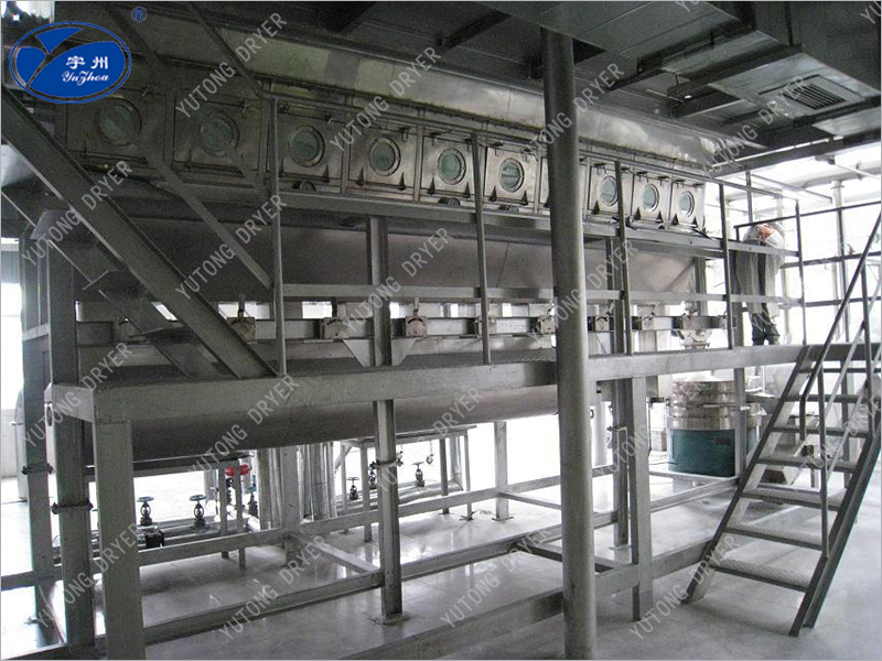 潔凈的熱風經閥板分配進入床體內,從加料器進入的濕物料被熱風形成沸騰狀態。由于熱風與物料廣泛接觸,增強了傳熱傳質的過程,因此在較短時間內就可干燥。如用連續型,物料從床體的一頭進入,經過幾十秒至幾分鐘沸騰干燥,自動從床體另一頭流出。本設備一般進行負壓操作。