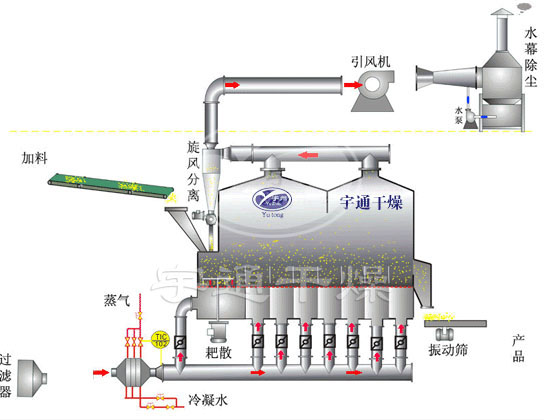 散粒狀固體物料由加料器加入流化床干燥機中, 潔凈的熱風經閥板分配進入床體內,從加料器進入的濕物料被熱風形成沸騰狀態。由于熱風與物料廣泛接觸,增強了傳熱傳質的過程,因此在較短時間內就可干燥。物料從床體的一頭進入,經過幾十秒至幾分鐘沸騰干燥后由排料口排出, 廢氣由沸騰床頂部排出經旋風除塵器組和布袋除塵器回收固體粉料后排空。