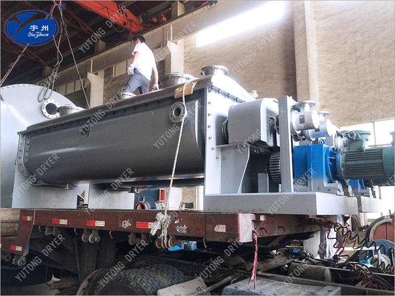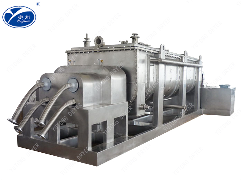 空心軸上密集排列著楔型中空漿葉,熱介質經空心軸流經漿葉。單位有效容積內傳熱面積很大,熱介質溫度從-40℃到320℃,可以是水蒸汽,也可以是液體型:如熱水、導熱油等。間接傳導加熱,沒有攜帶空氣帶走熱量,熱量均用來加熱物料。熱量損失僅為通過器體保溫層向環境的散熱。楔型漿葉傳熱面具有自清潔功能。物料顆粒與楔型面的相對運動產生洗刷作用,能夠洗刷掉楔型面上附著物料,使運轉中一直保持著清潔的傳熱面。漿葉干燥機的殼體為Ω型,殼體內一般安排二到四根空心攪拌軸。殼體有密封端蓋與上蓋,防止物料粉塵外泄而充分發揮作用。