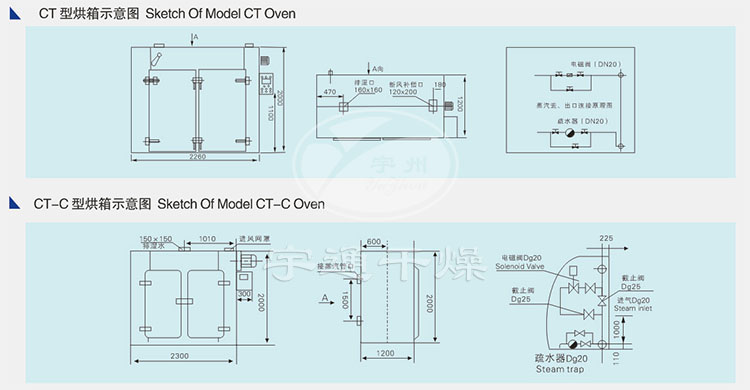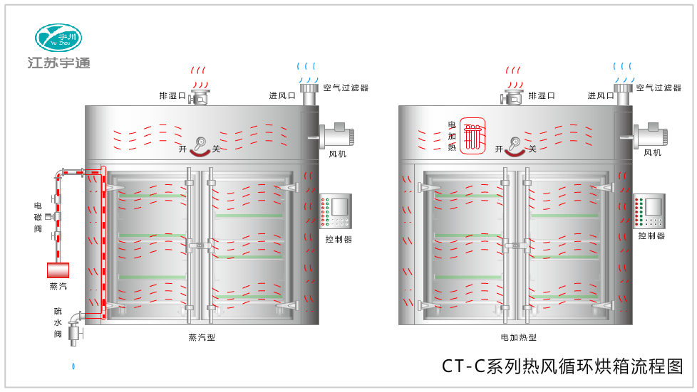 經(jīng)過多次改造, 形成了CT-C系列烘箱, 該系列全部采用軸流風(fēng)機,配用了自動恒溫控制系統(tǒng), 并備用電腦控制系統(tǒng)供選擇。熱效率達70%左右,它是利用蒸汽或電為熱源, 用軸流風(fēng)機對熱交換器對流換熱的方式加熱空氣,熱空氣層流經(jīng)過烘盤與物料進行熱量傳遞。不斷的補充新鮮空氣與不斷排出濕熱空氣, 這樣來保證烘箱內(nèi)適當(dāng)?shù)南鄬穸取1鞠盗泻嫦涞拇筇攸c是部分熱風(fēng)在箱內(nèi)進行循環(huán),整個循環(huán)過程為封閉式,從而增強了傳熱,節(jié)約了能源。