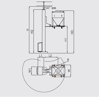 該機(jī)只要由立柱、轉(zhuǎn)動(dòng)底盤、提升叉架、液壓系統(tǒng)和控制系統(tǒng)組成。工作時(shí)將裝滿物料的料斗推入提升叉架上,操作提升操作桿,將料斗提升到加料高度后轉(zhuǎn)動(dòng)立柱與加料設(shè)備對(duì)接,打開(kāi)出料蝶閥,使物料轉(zhuǎn)移到下一工序設(shè)備。