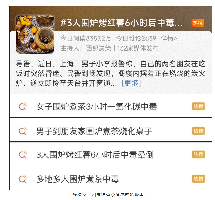 不過(guò),我們也看到圍爐煮茶已造成多地多起意外傷亡事件——一氧化碳中毒。